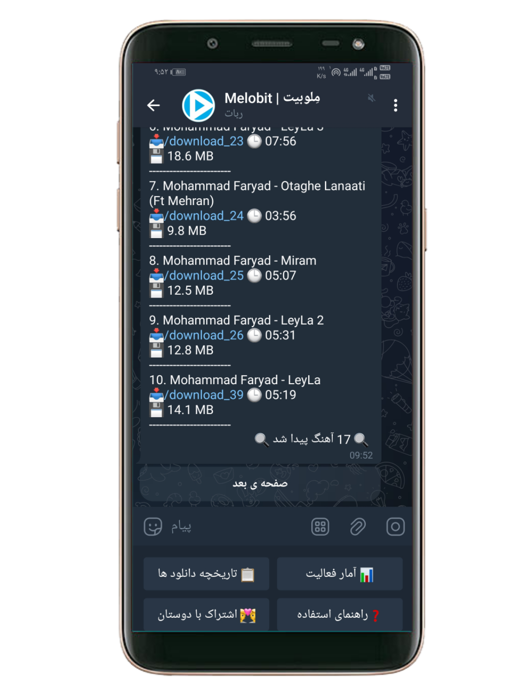 همچنین امکان مشاهده تمام موزیک های داخل ربات توسط ادمین و کاربران به صورت لیست وار هم در این ربات فراهم است.