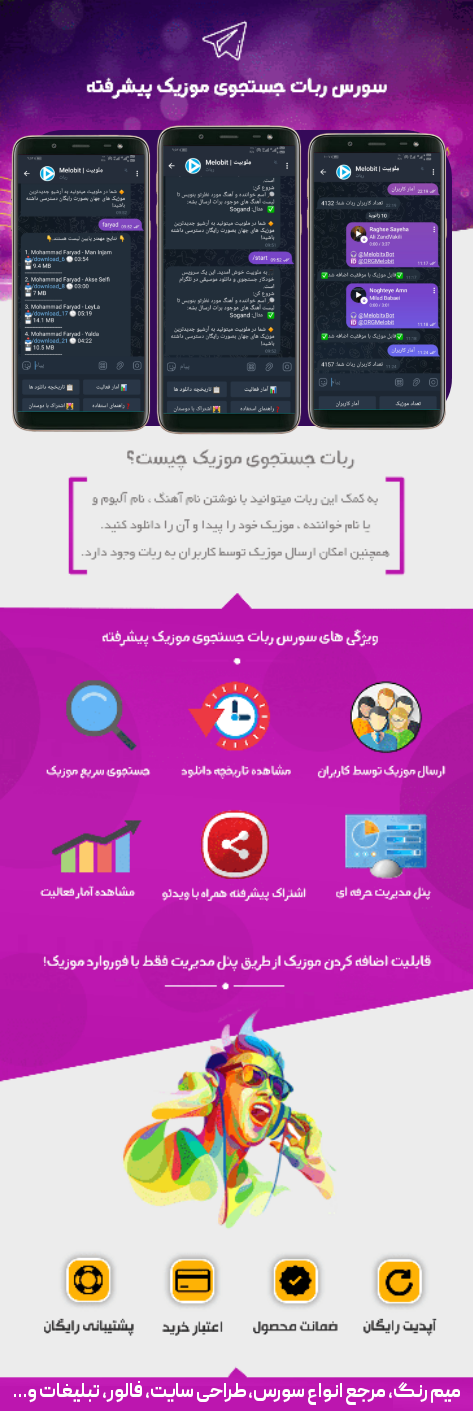 با سلام خدمت دوستان و کاربران محترم میم رنگ در این بخش قصد داریم به شما سورس ربات جستجوی موزیک با پنل مدیریت حرفه ای را معرفی و ارائه کنیم.